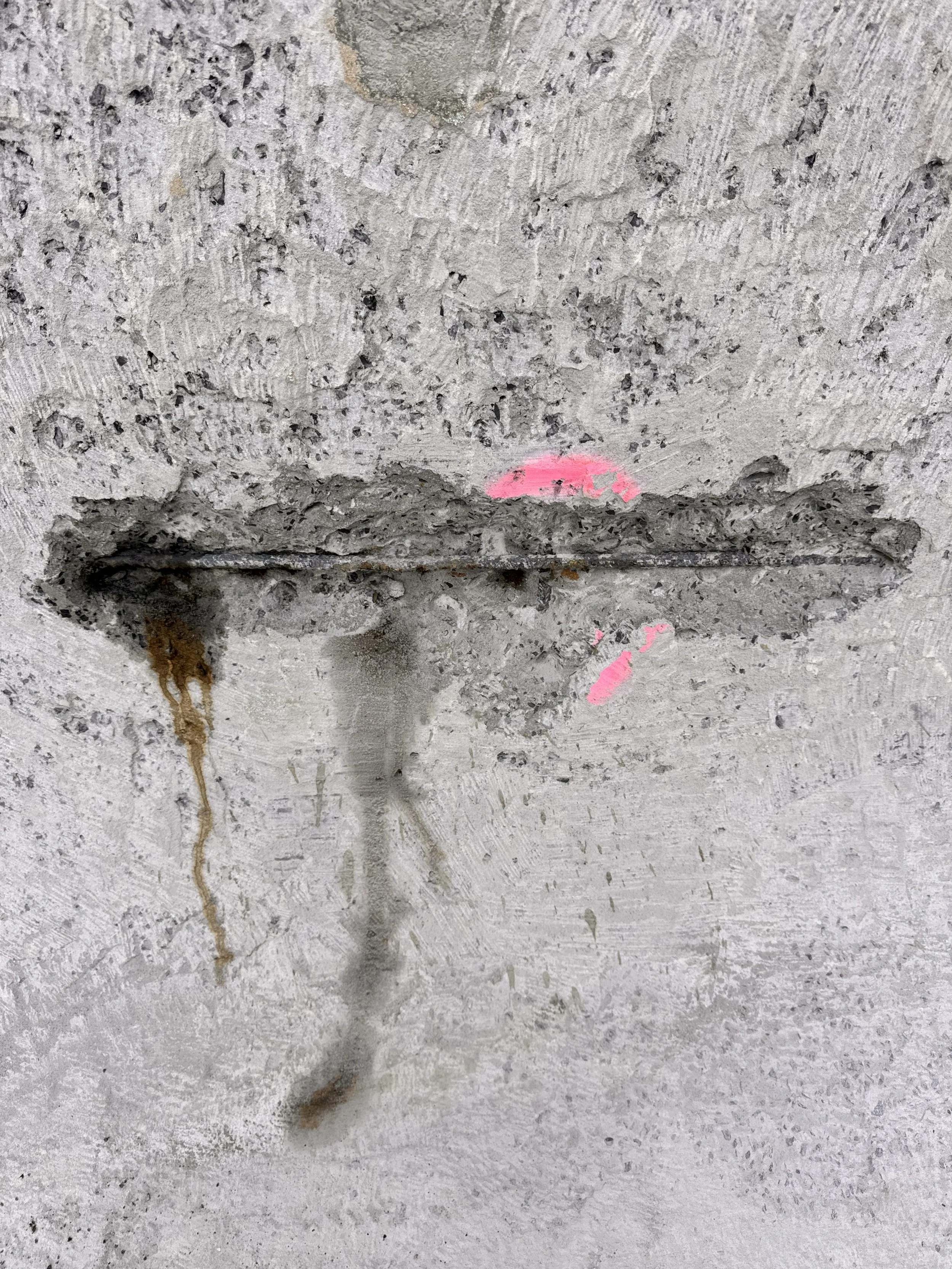 The Sign: Rust stains bleeding through concrete/tiles/Beadcrete, spalling (flaking/cracking) of concrete; visible corrosion of reinforcing steel.